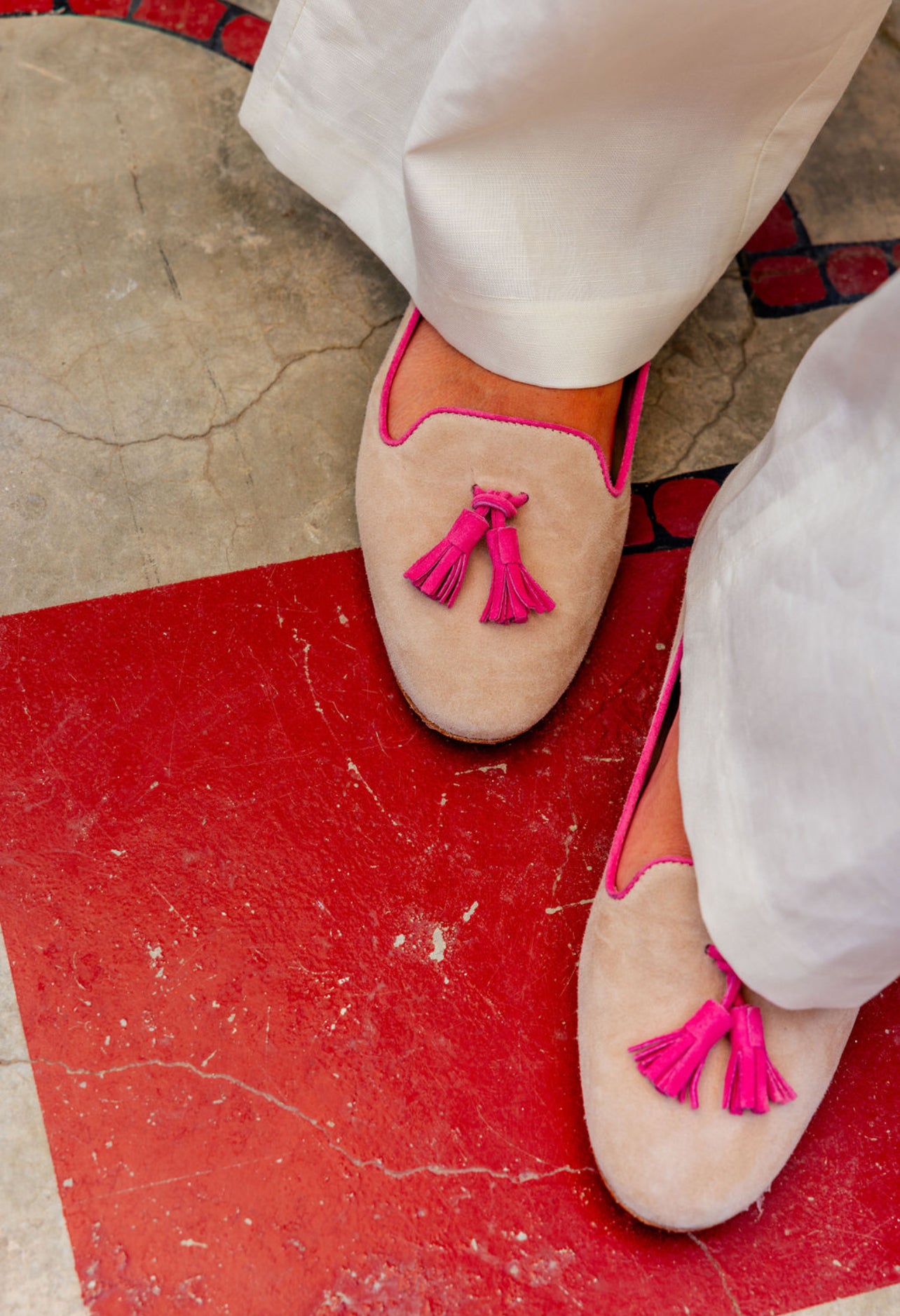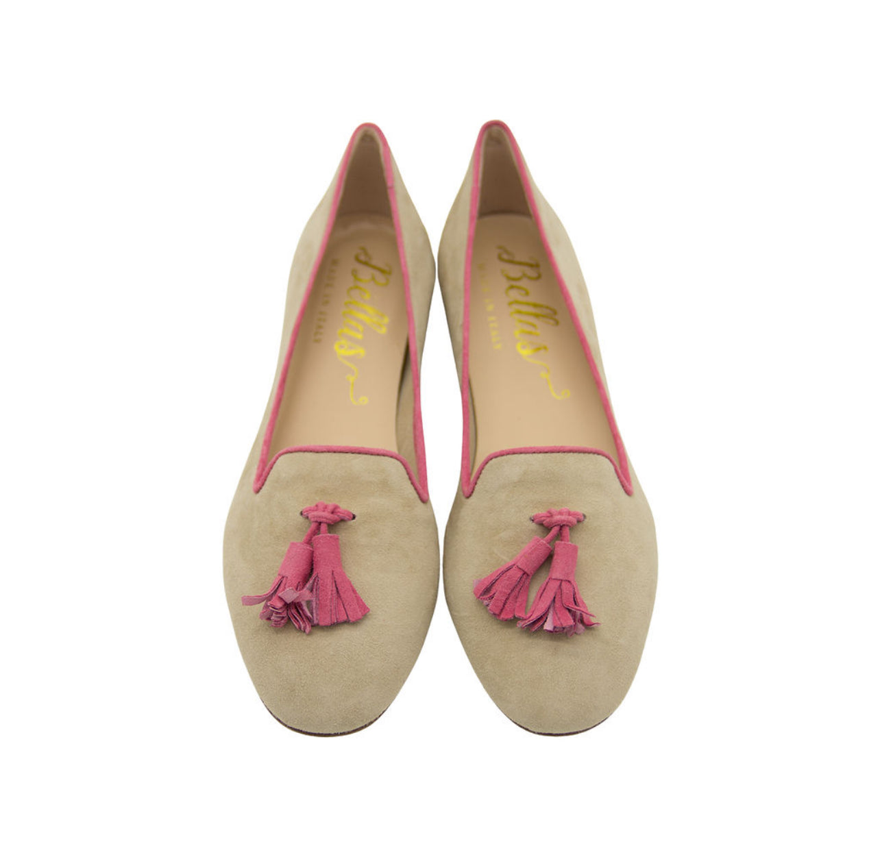Obermaterial: Beiges Wildleder mit korallfarbenem Tassel