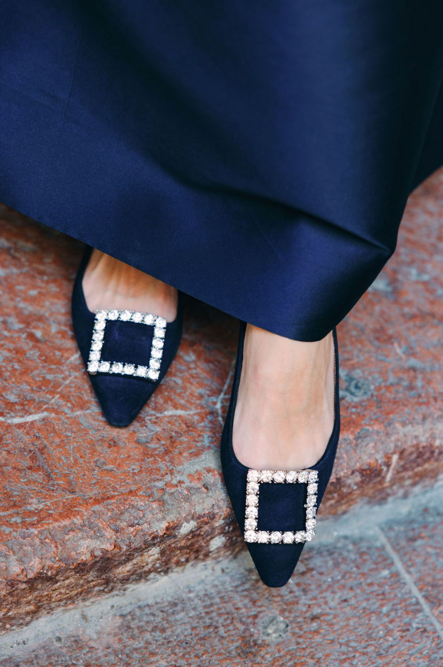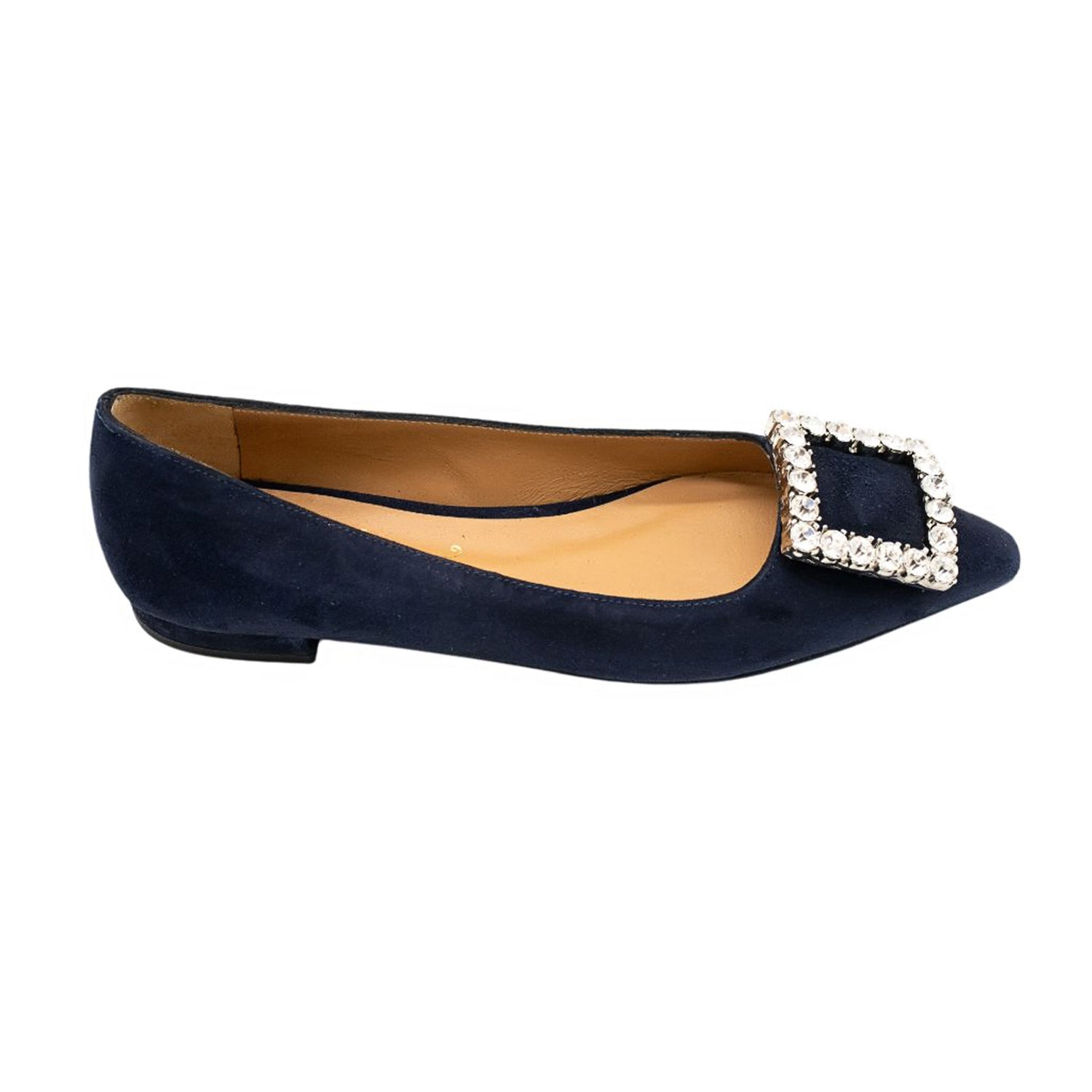 Spitzer Loafer aus dunkelblauem Wildleder mit Strass-Applikation