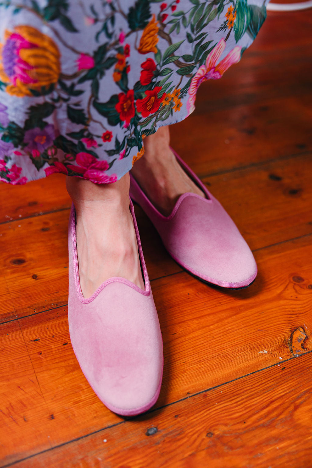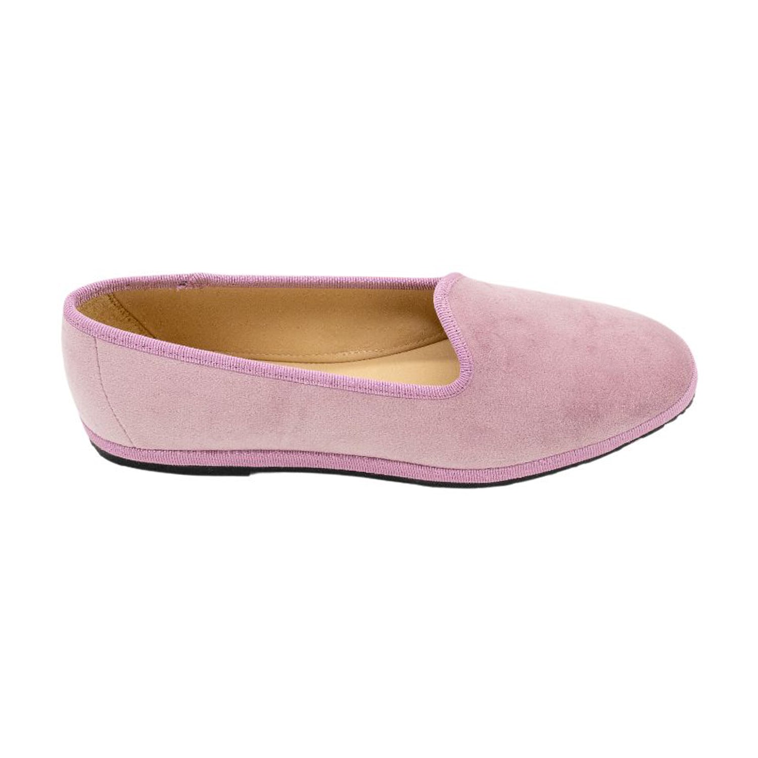 Upper material: 100% velvet in old pink with light pink grosgrain ribbon edging