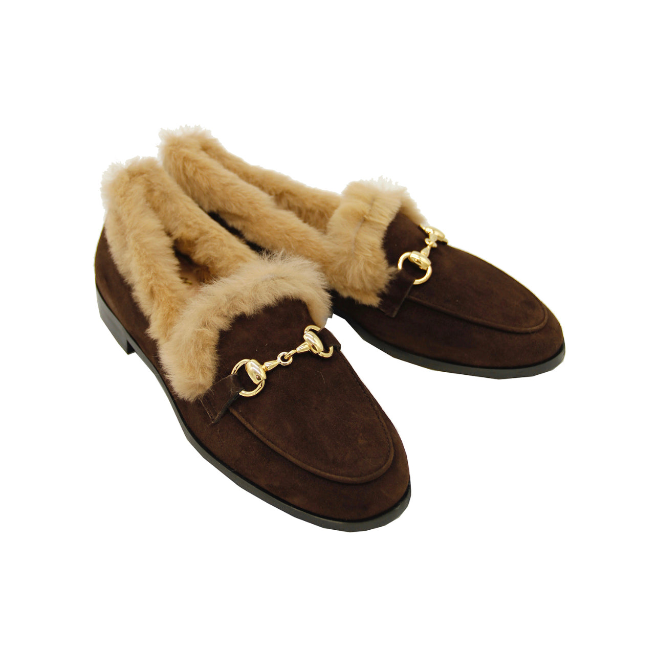 Our lined penny loafers in dark brown with a gold bridle are wonderfully soft and warm and ideal for winter. The real rabbit fur is the most comfortable lining for these particularly exclusive loafers and thanks to the thick rubber sole, they are a robust companion even in winter weather conditions.