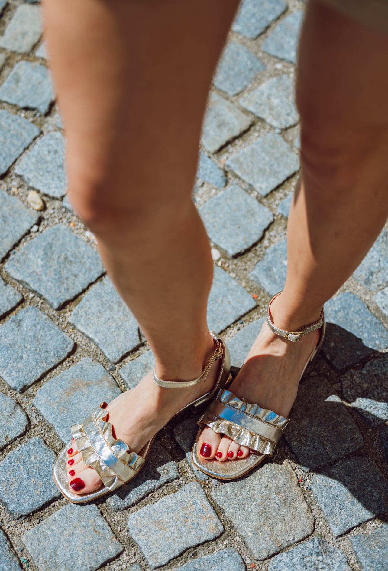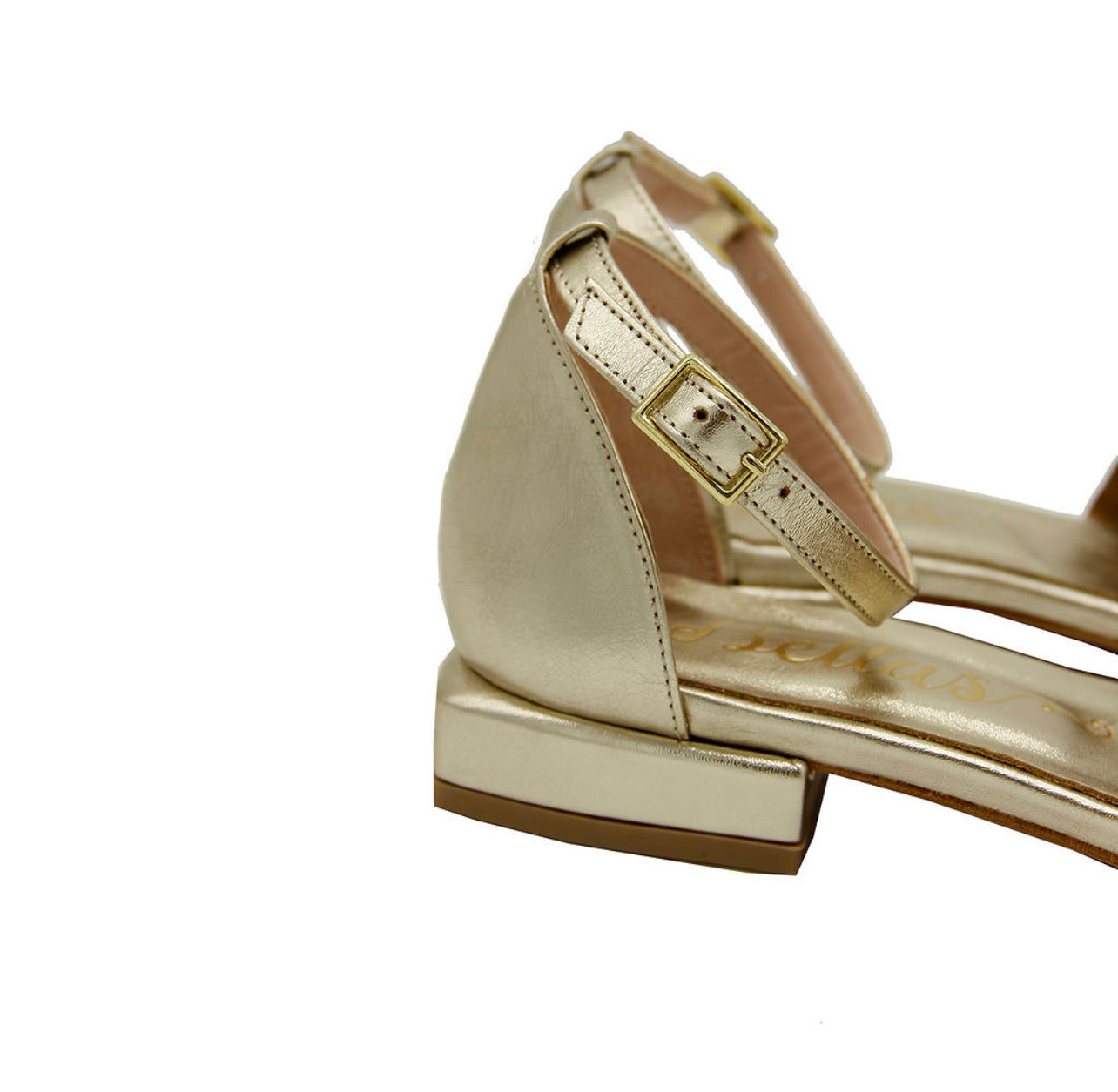 100% handmade sandals made of golden smooth leather with ruffle appliqué