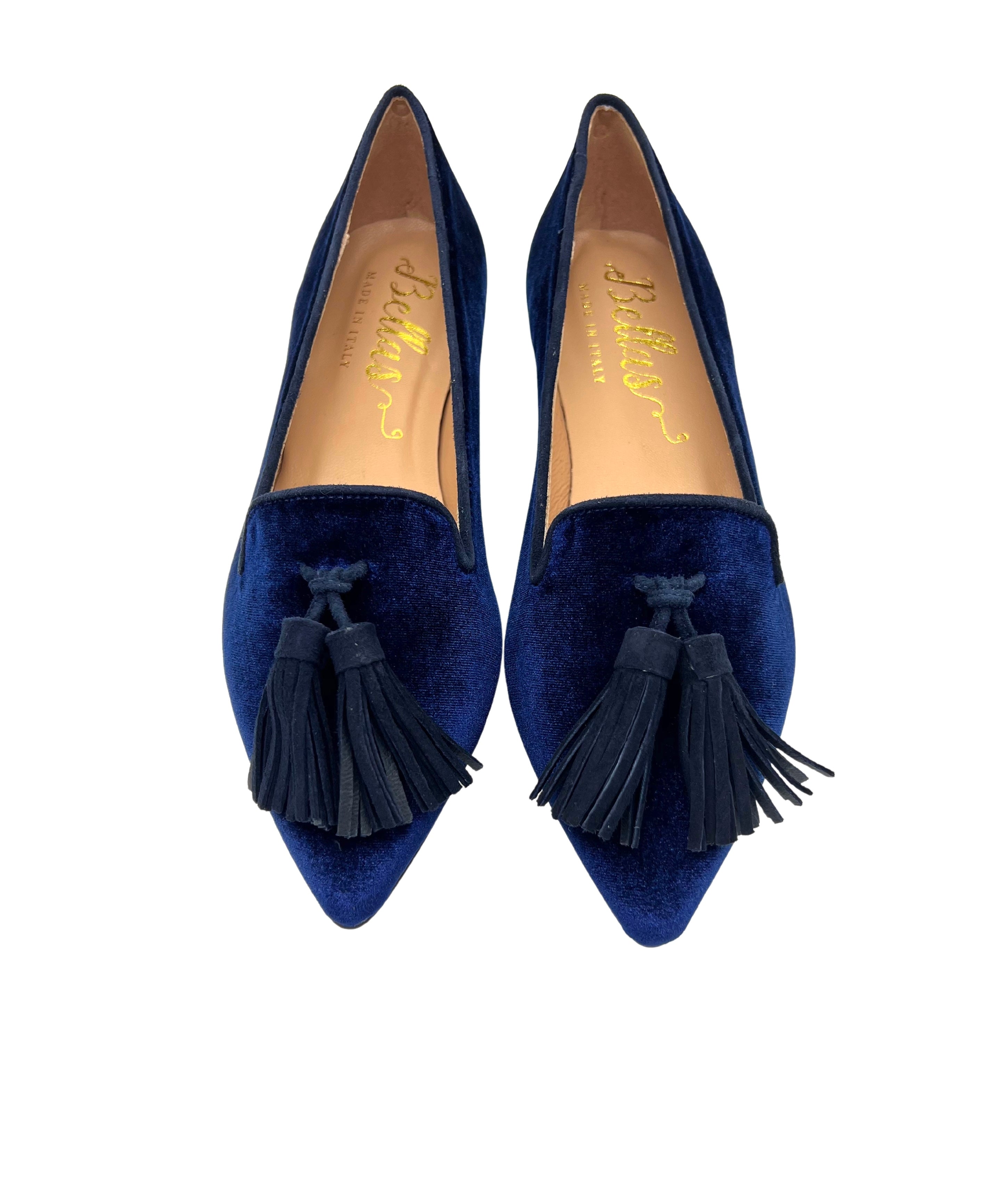 Pointed loafer in dark blue velvet with dark blue suede tassel