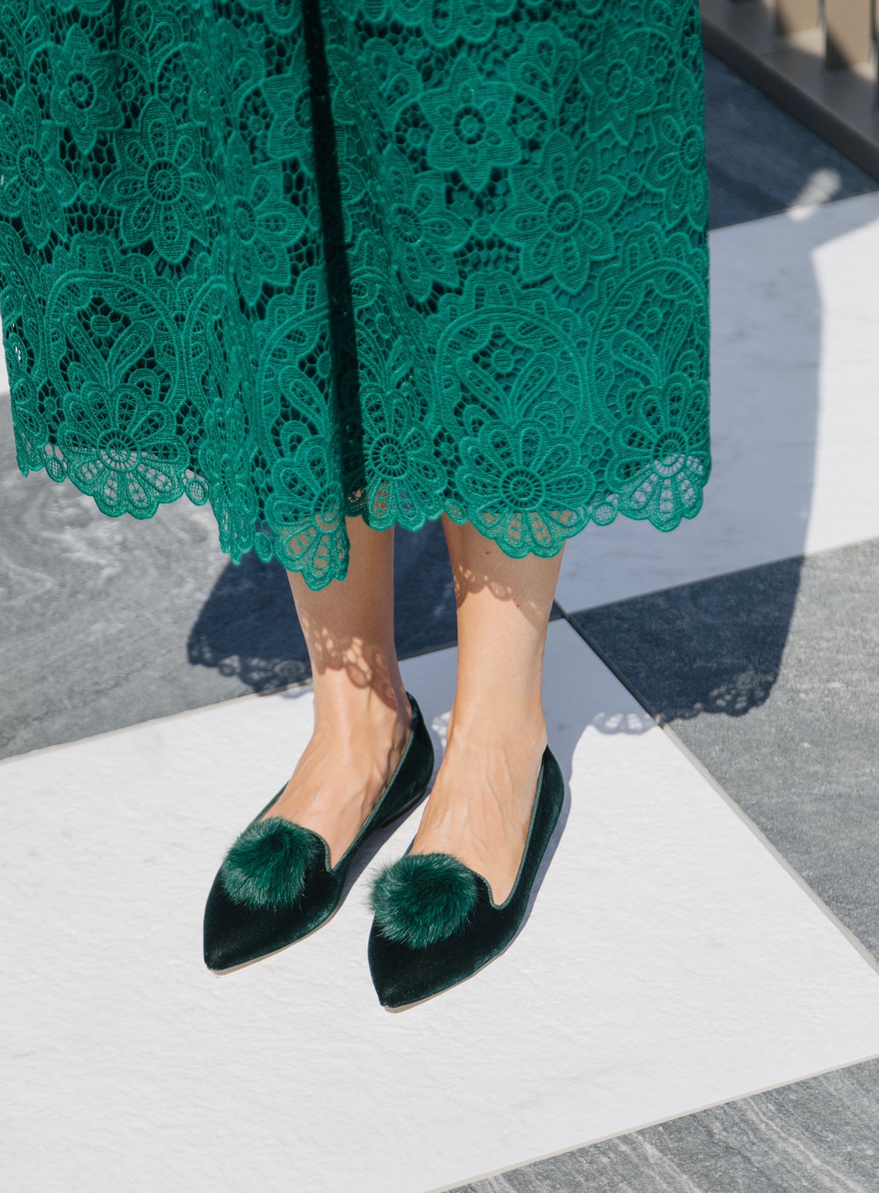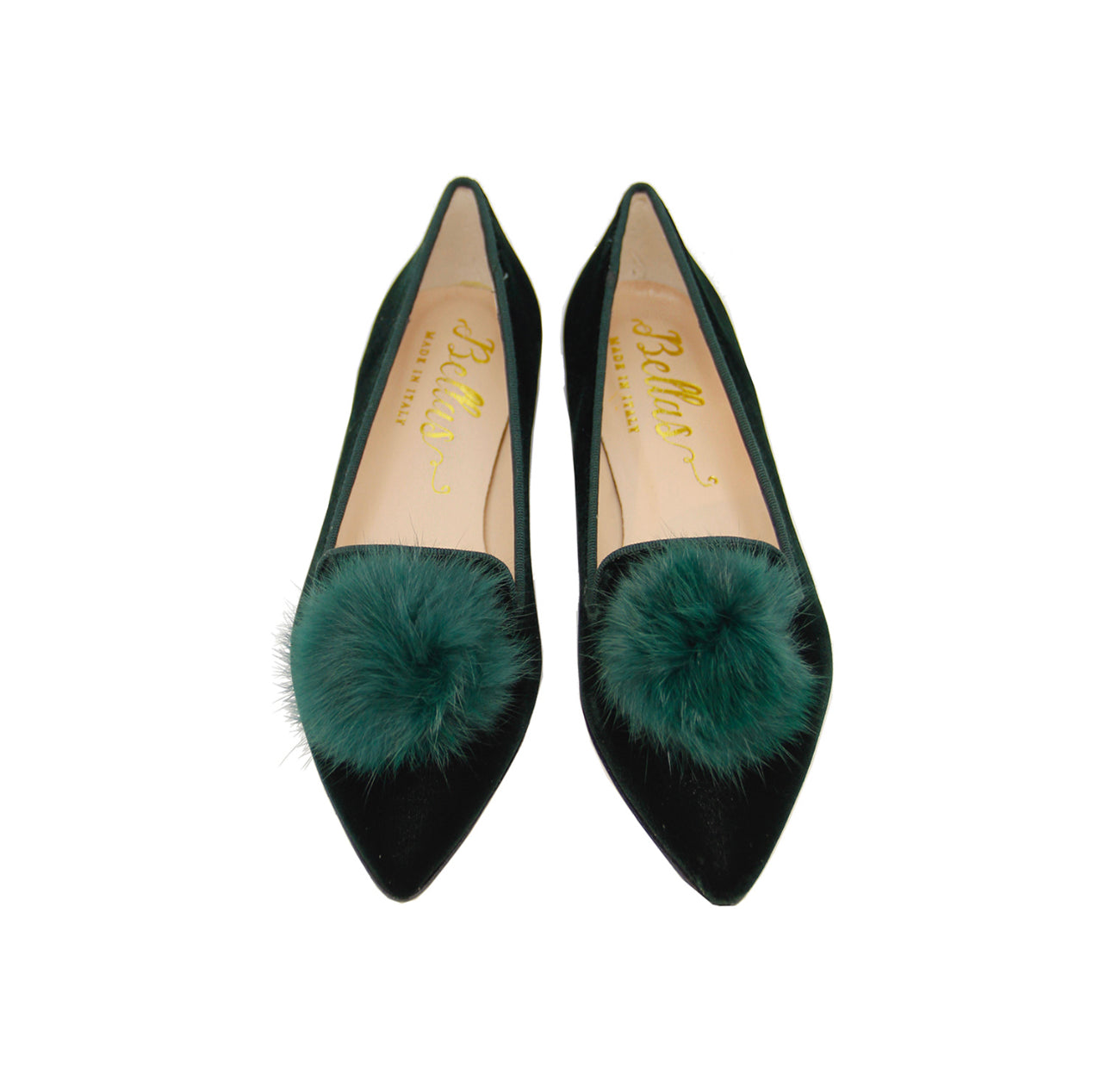 Pointed loafer in dark green velvet with rabbit fur accessories