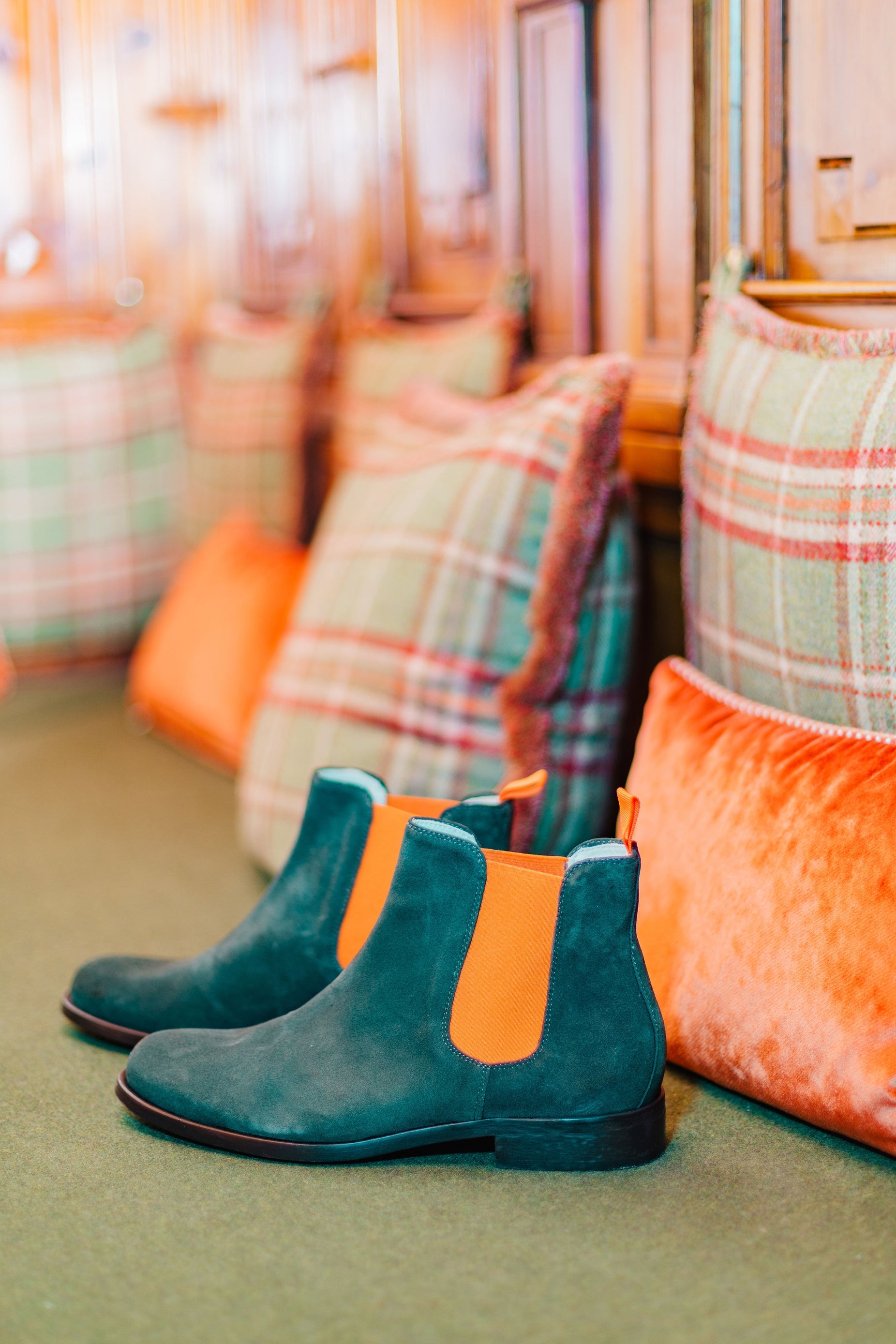 Dunkelgrüne Chelseaboot Stiefelette mit farbigem Einsatz in orange