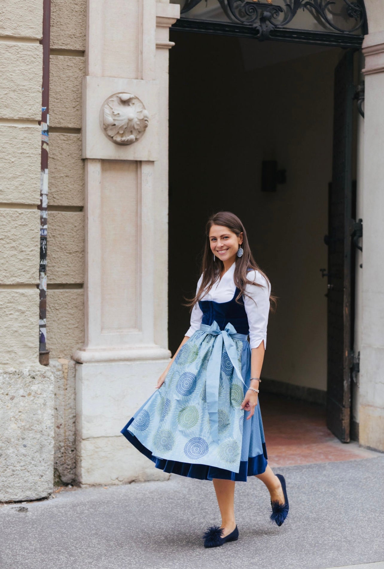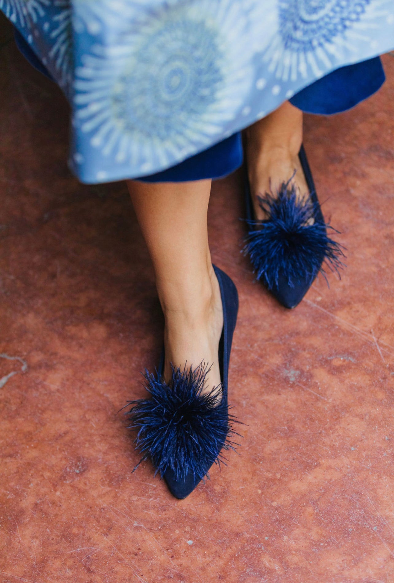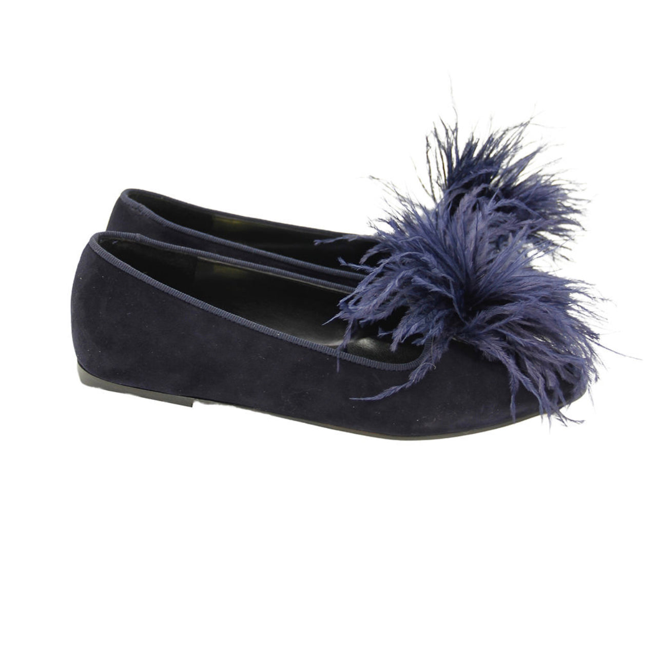 Ballerina in dunkelblau mit Feder-Applikationen