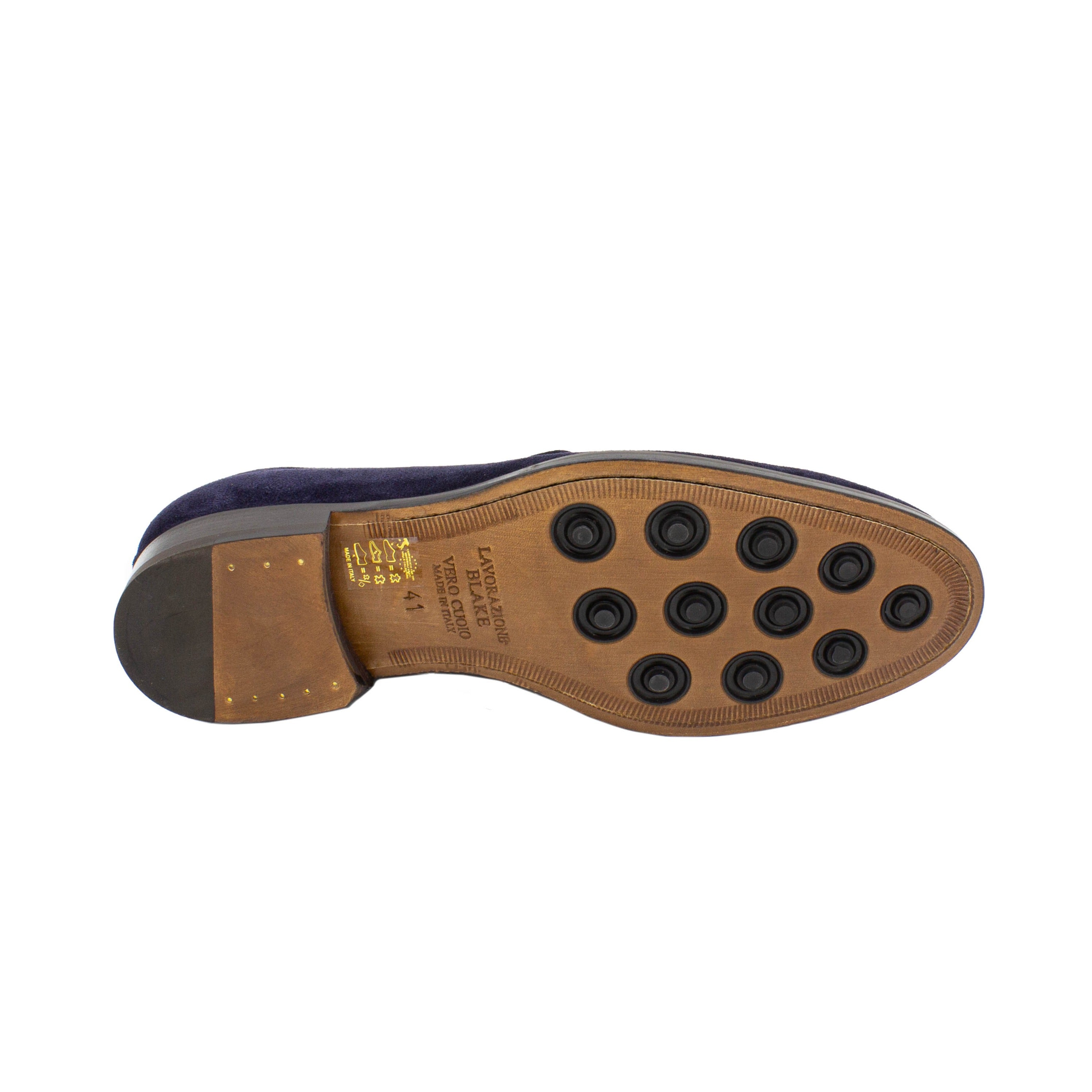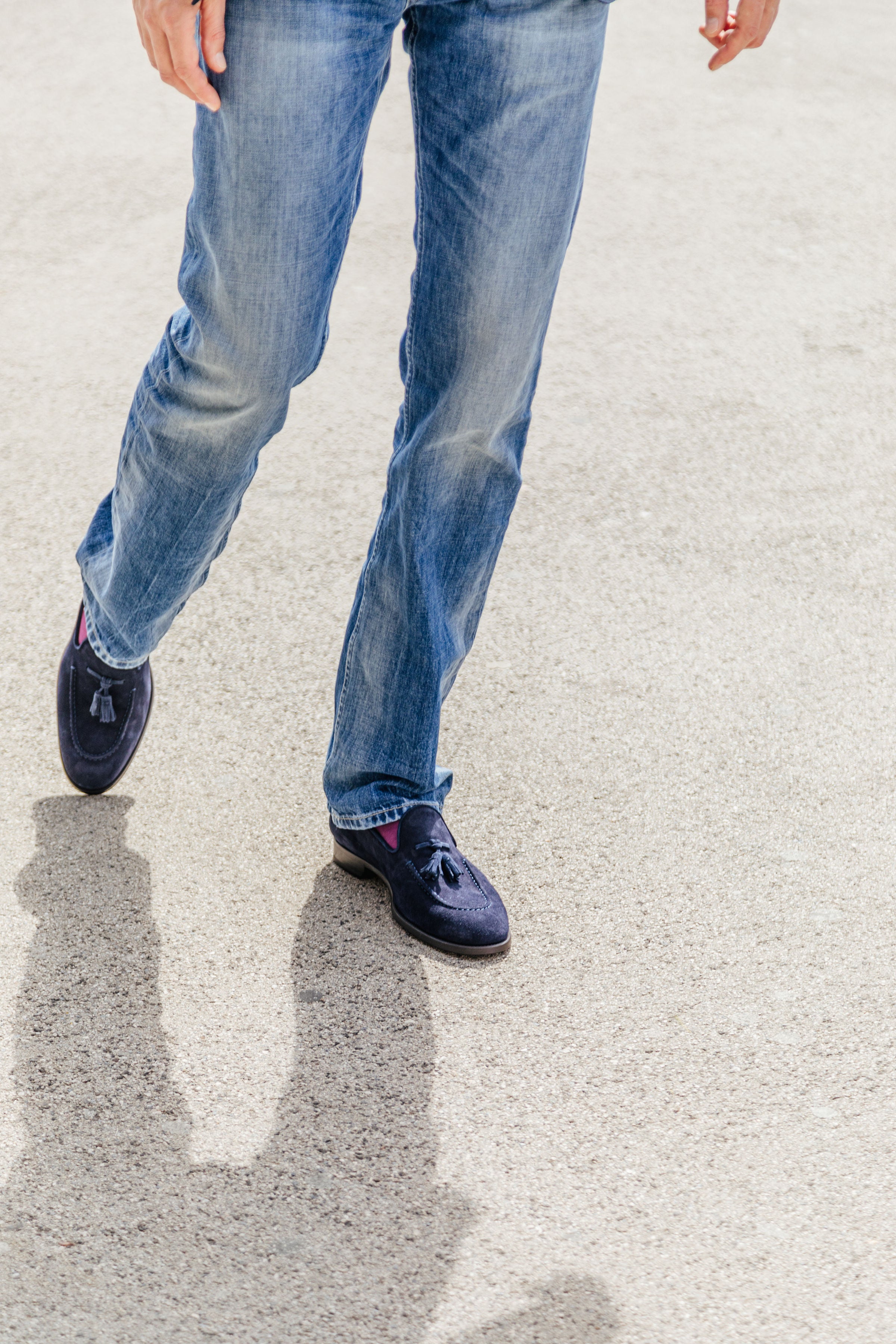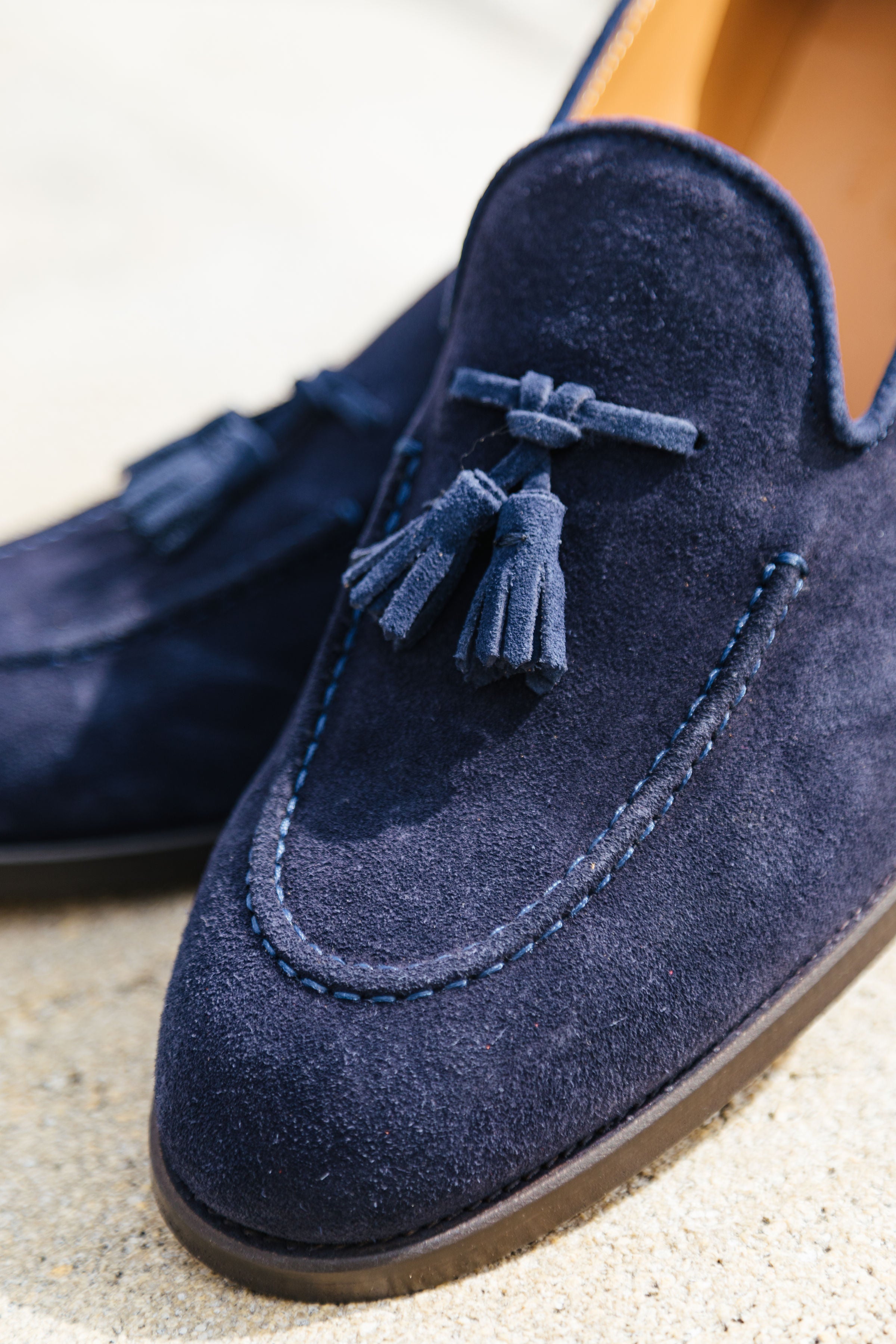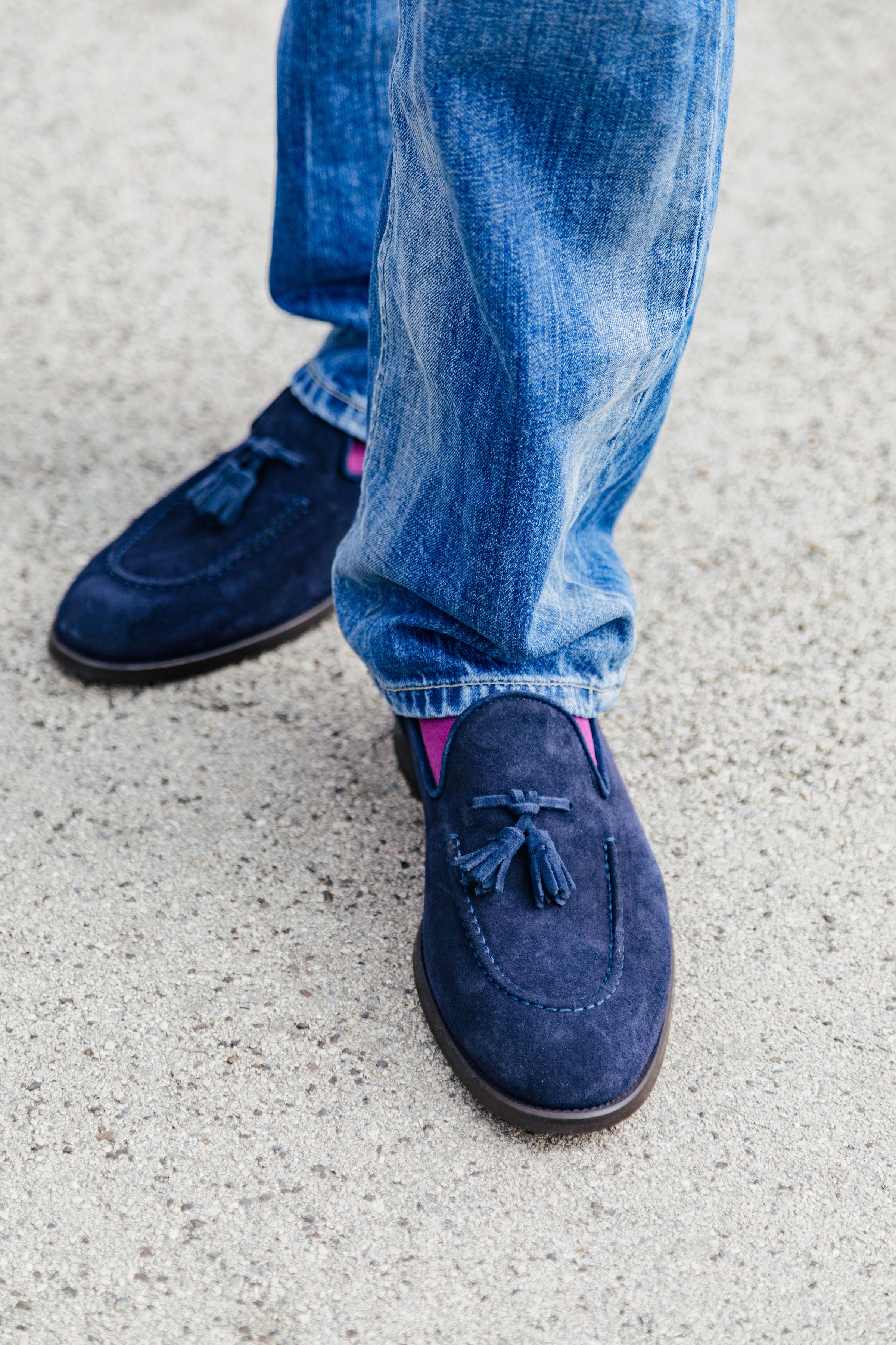 Unsere dunkelblauen Tassel Loafer werden in einer kleinen italienischen Manufaktur nach unseren Vorgaben gefertigt und verfügen über eine ausgezeichnete Passform. Die Schuhe weisen eine schicke und gleichzeitig zeitlose Silhouette auf, die es ermöglicht, dass der Schuh perfekt zum Business-Anzug aber auch zur Freizeitkleidung kombiniert werden kann.
