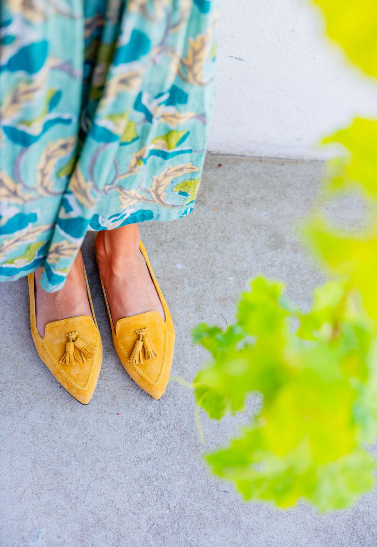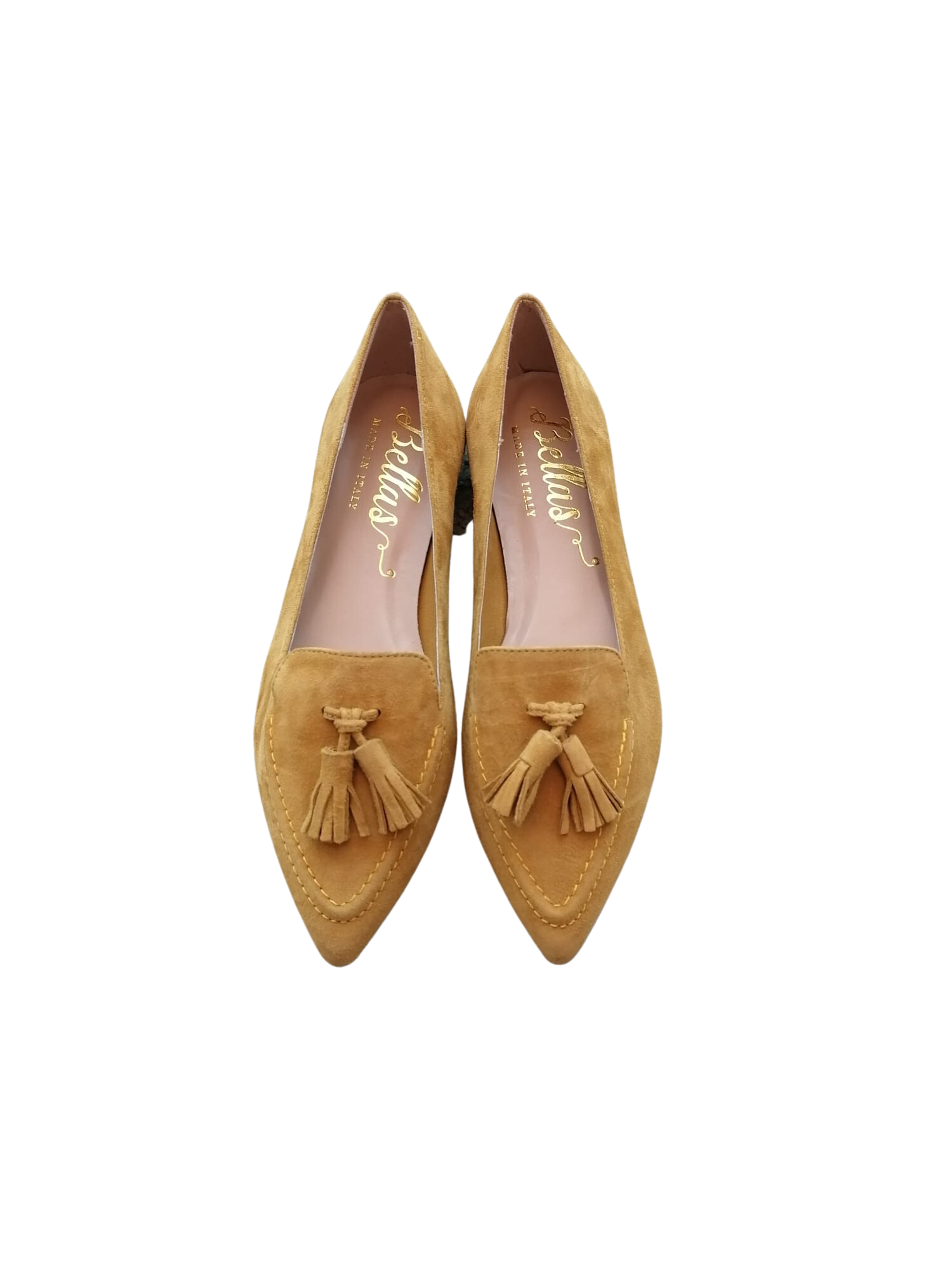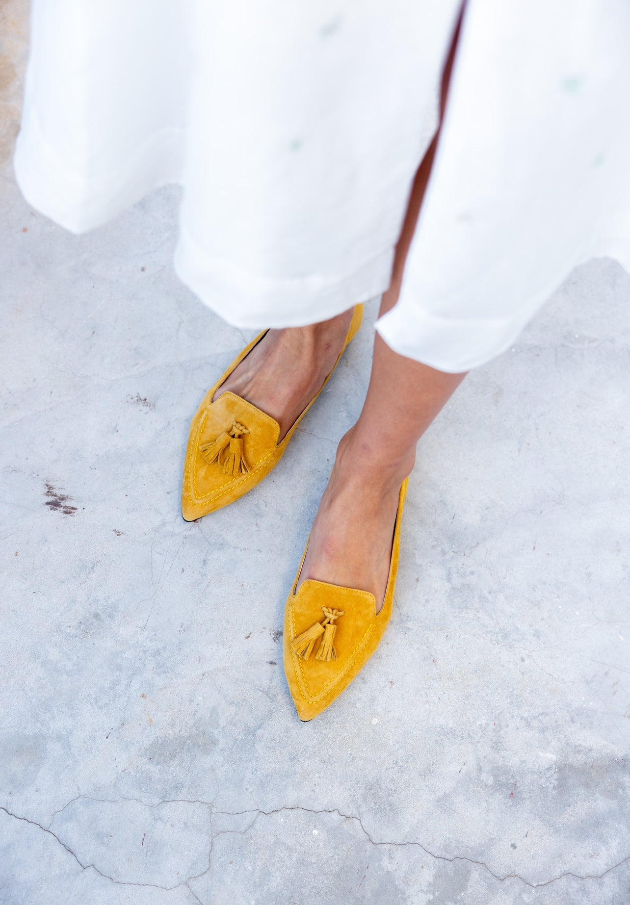 Spitzer Tasselloafer aus Wildleder in senfgelb