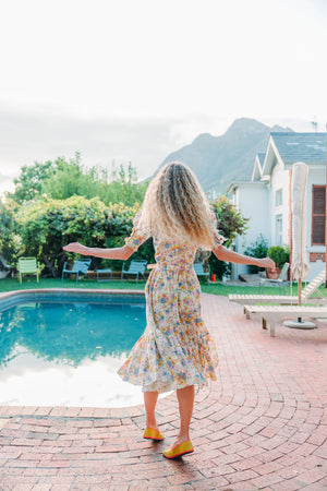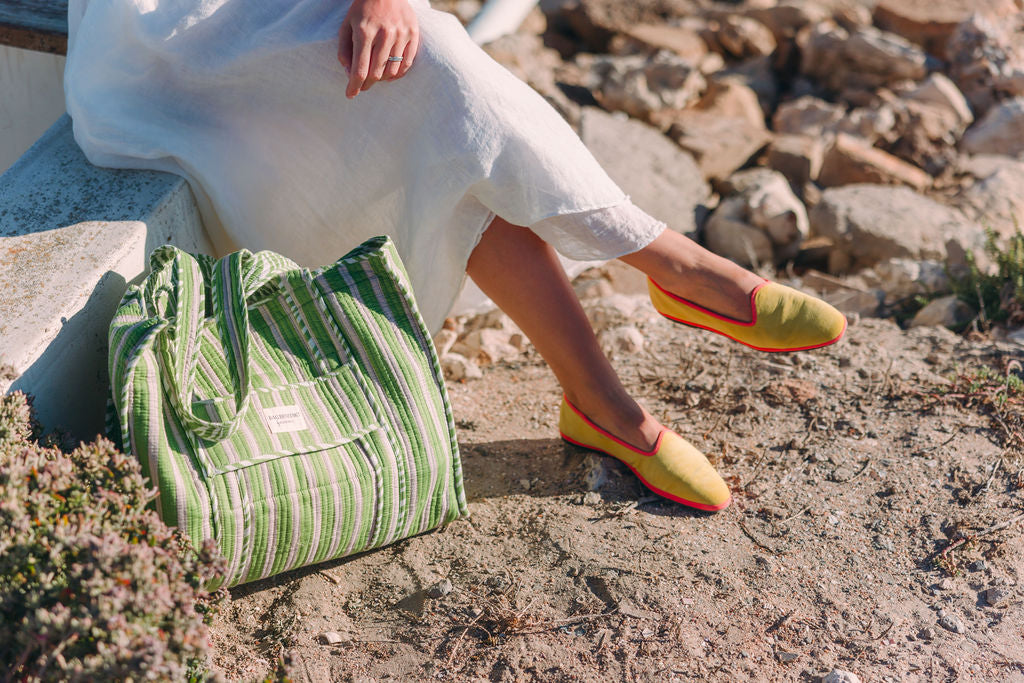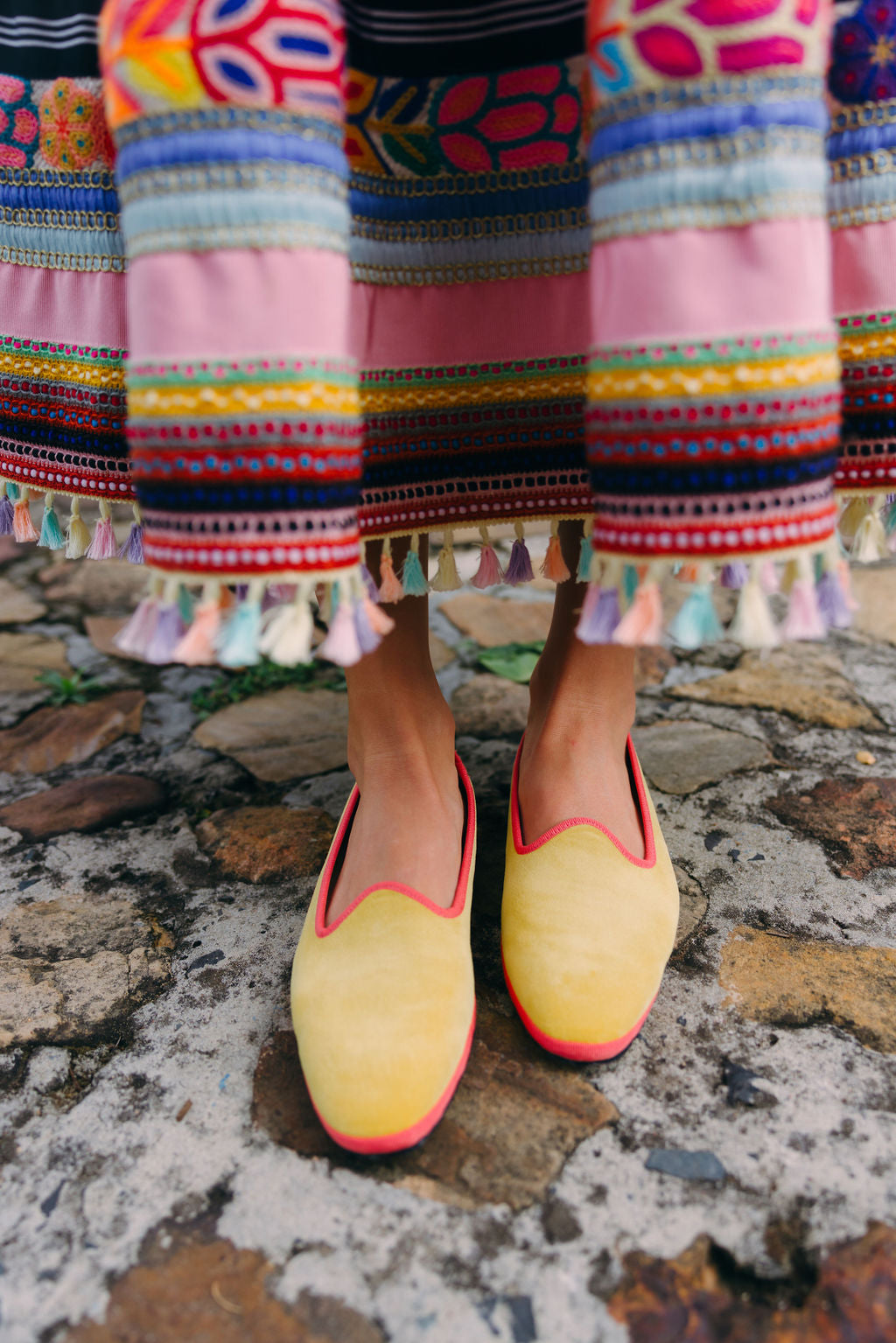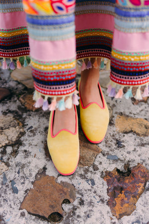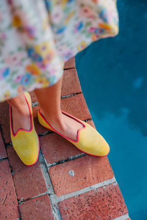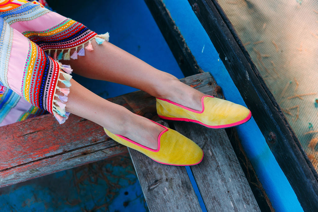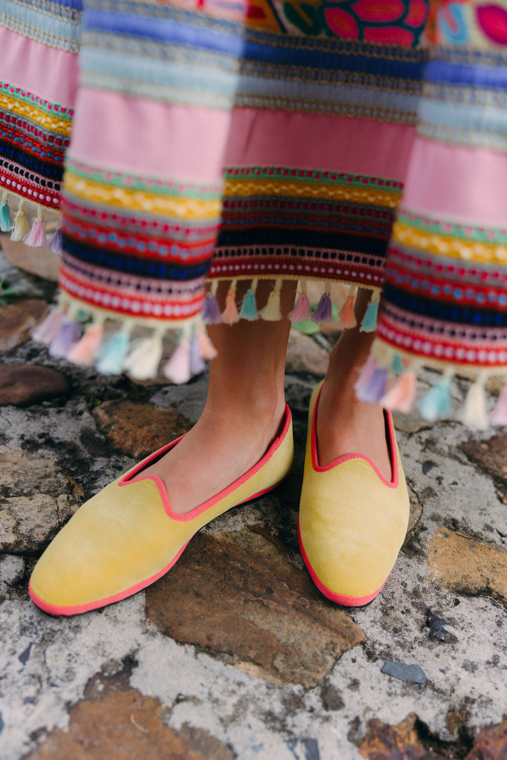 Obermaterial: 100% zitronengelber Samt mit lachs-rosa Einfassung