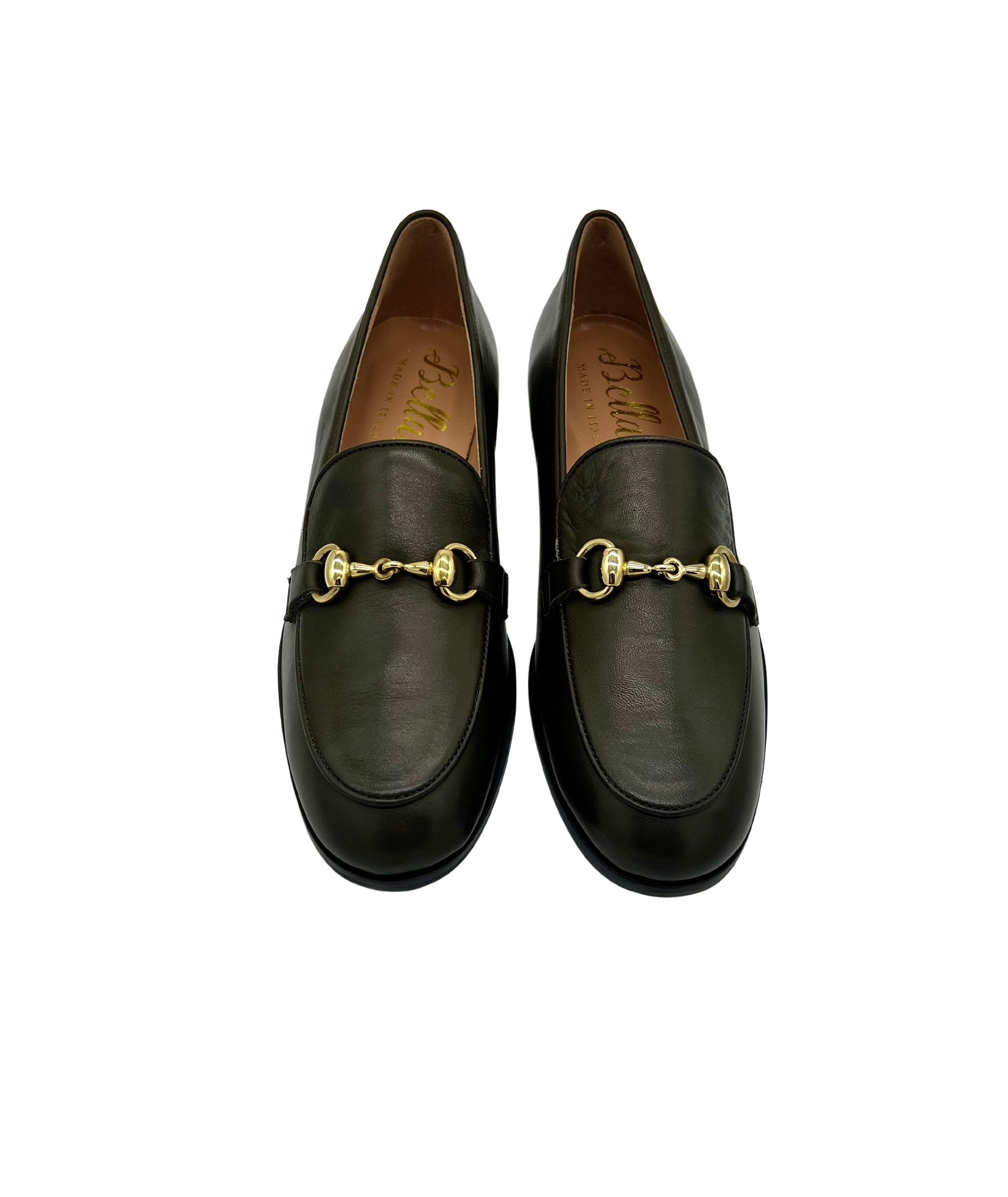 Obermaterial: 100% dunkelgrünes Glattleder mit goldener Trense