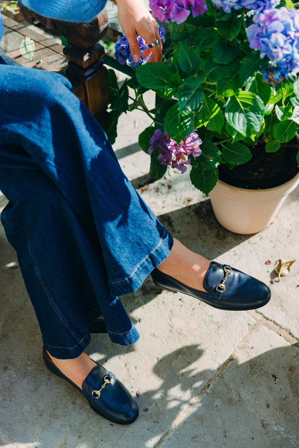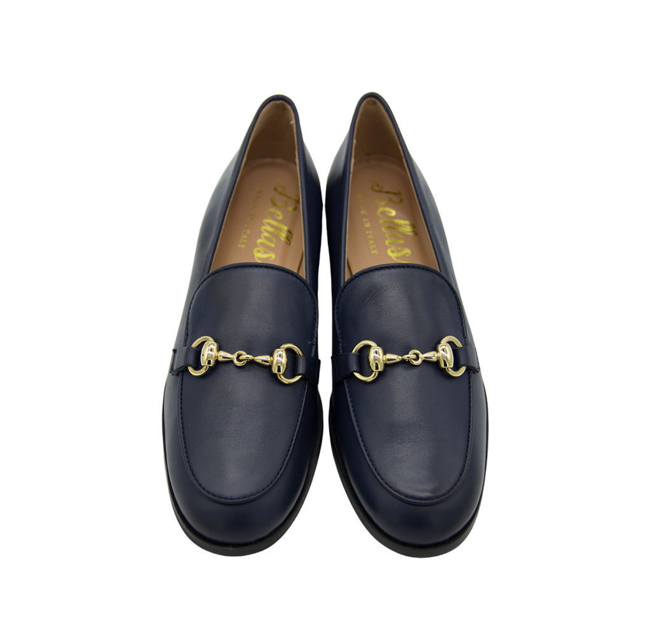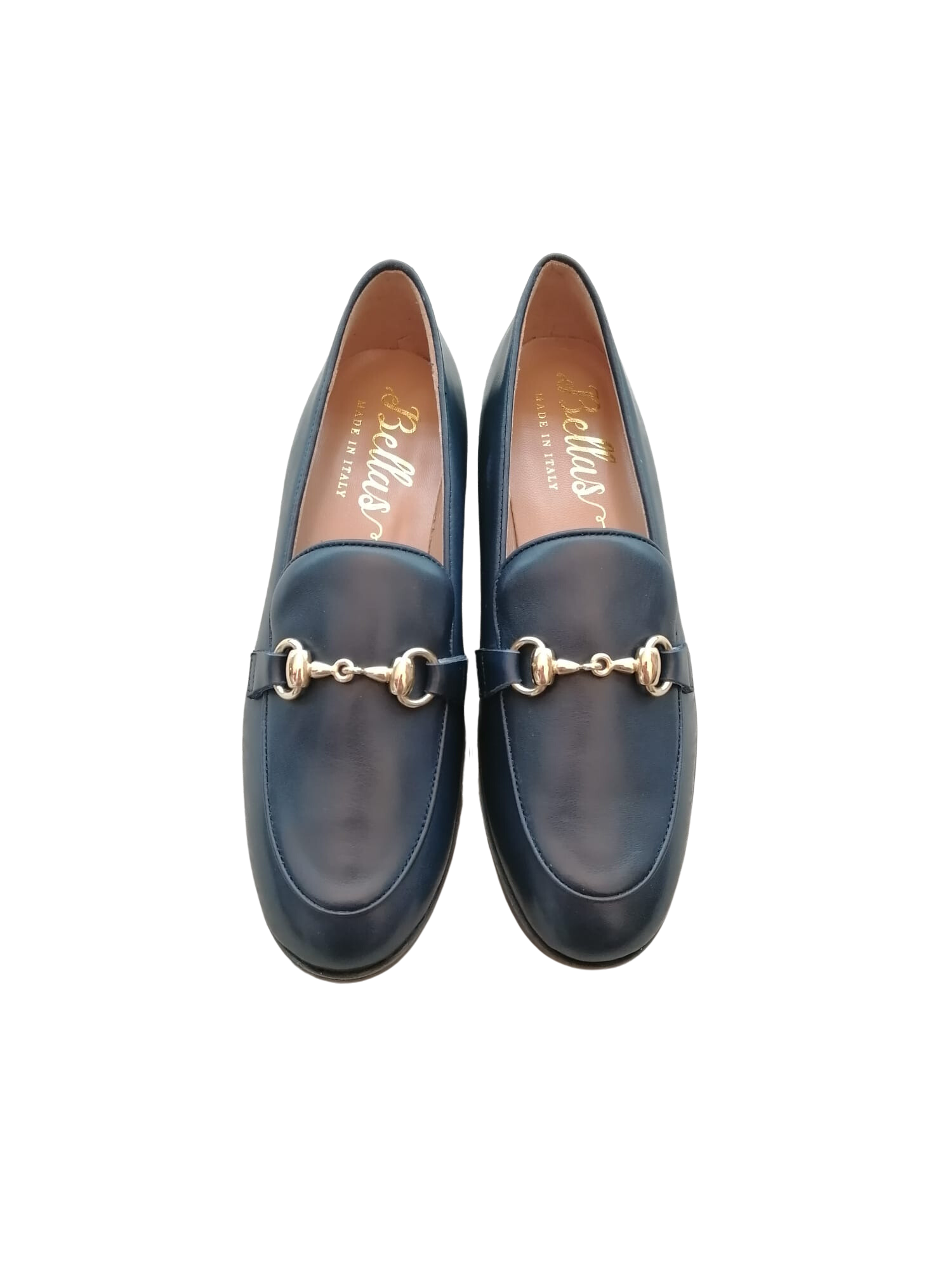 Obermaterial: 100% dunkelblaues Glattleder mit goldener Trense