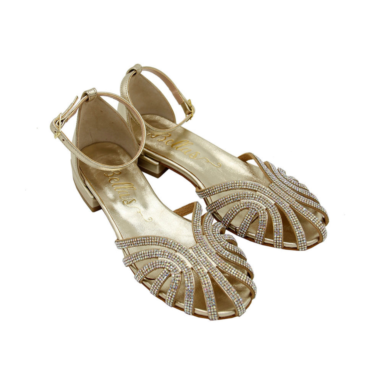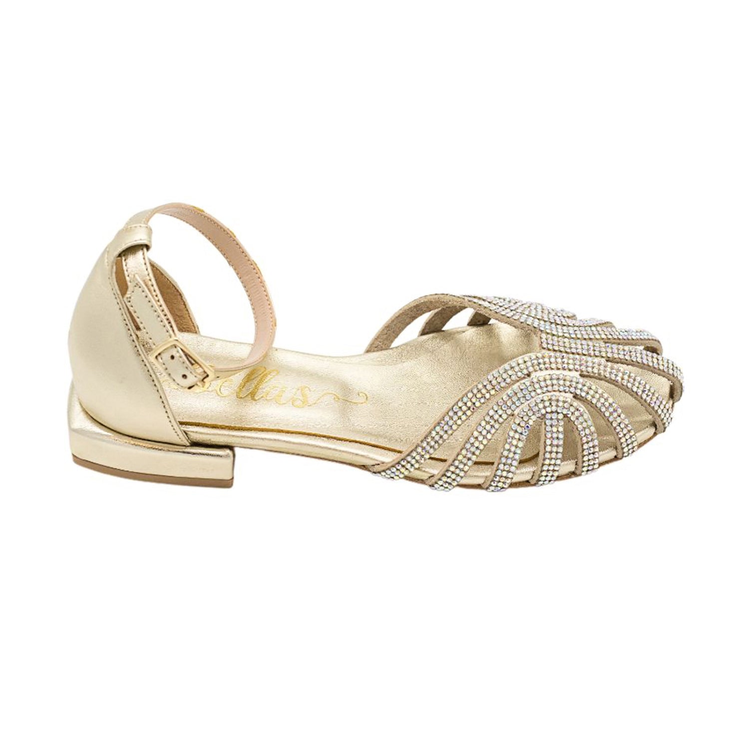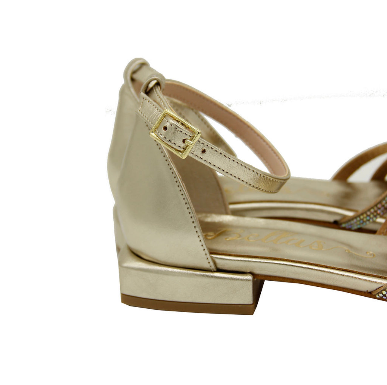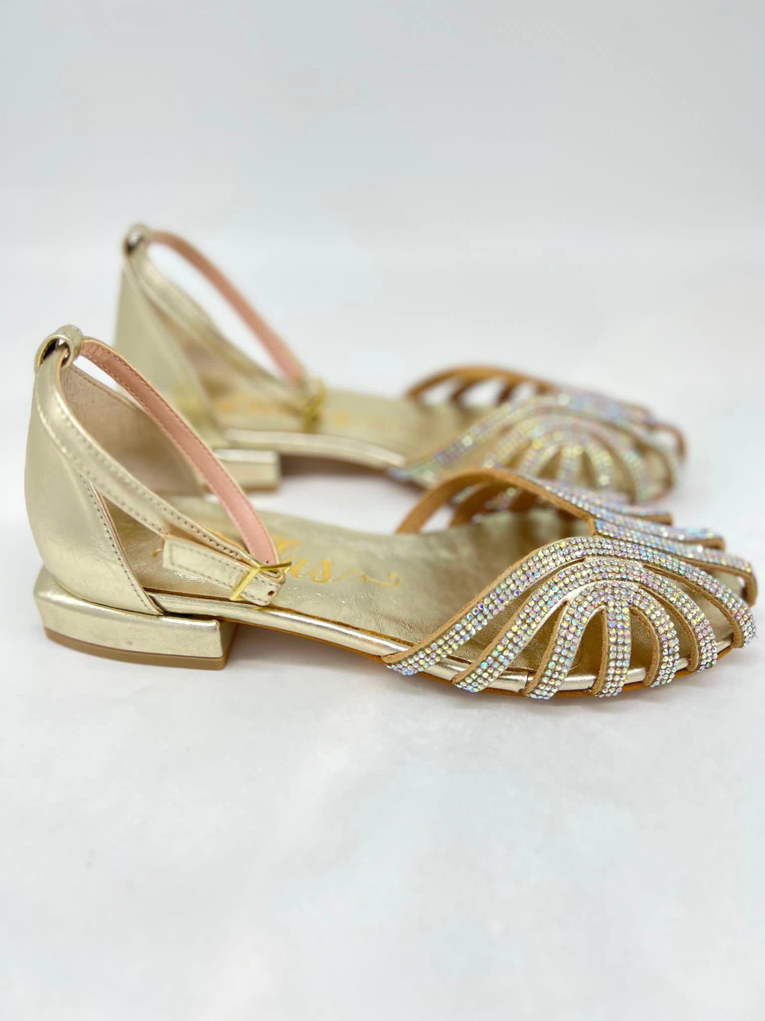100% Handgemachte Sandalen aus goldenem Glattleder mit Strass-Applikation